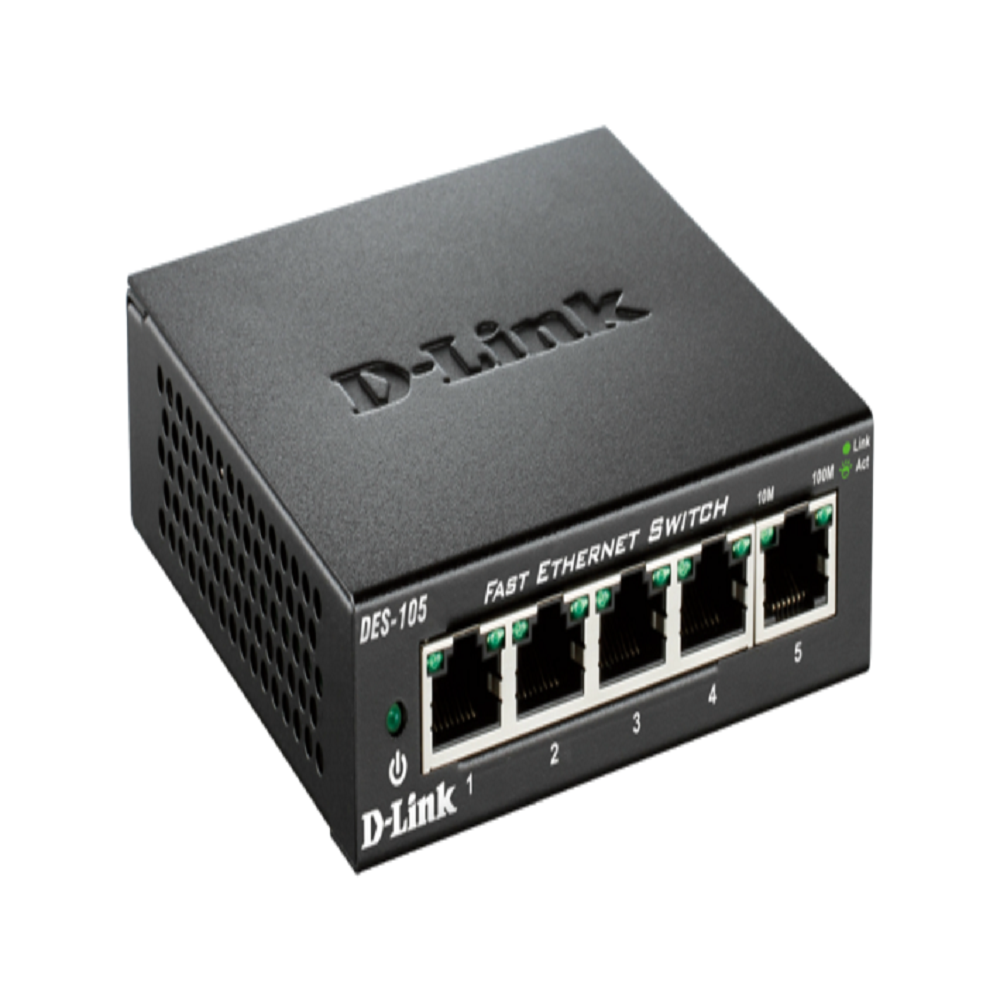 The DES-105 5-Port Fast Ethernet Unmanaged Desktop Switch is a 5-port 10/100 Mbps Fast Ethernet switch that allows you to quickly set up a wired network. Connect the DES-105 to multiple computers together to share files and folders, or connect it to a router to share an Internet connection.