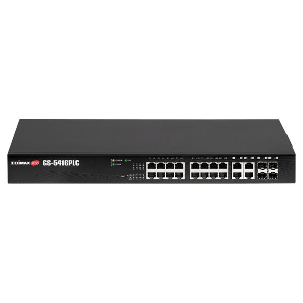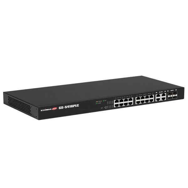 The Edimax Pro GS-5416PLC smart switch comes with web-based user interface, 16 Gigabit PoE+ ports and 4 RJ45/SFP combo ports for high-speed Gigabit and long-range copper or optical connections. With smart features in SNMP v3, PoE PD Alive Check, Dual Firmware, Voice VLAN, DHCP Snooping, QoS, CoS, STP, 802.1Q VLAN, IPv4/IPv6, Port Trunk, IGMP v1/v2/v3 Snooping and Mirror, the smart switch provides a cost effective, reliable, scalable and secure switch solution for SMB networks. The Edimax-specific long range mode enables power and data transmission to up to 200 meters at a speed of 10Mbps, tailored for IP cameras and far away network device applications. The PoE also features auto detection and power backfeed protection to efficiently provide power and, at the same time, avoid damaging the PoE ports. The Edimax GS-5416PLC is the ideal solution to increase the distance/speed of your network server and backbone connections.