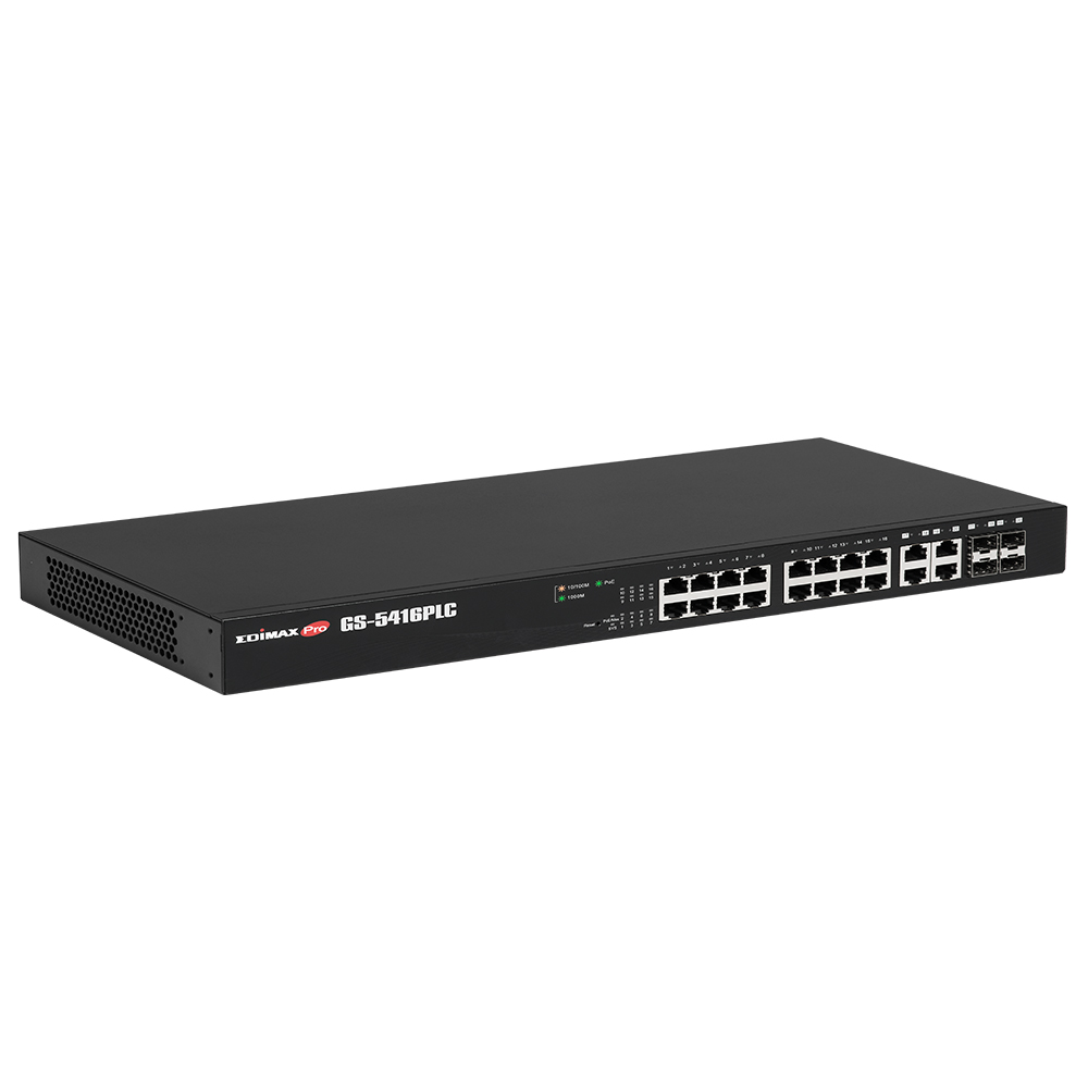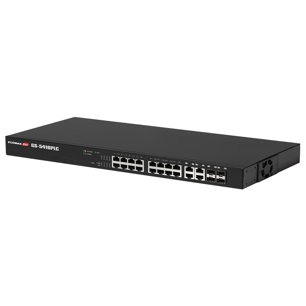 Complies with IEEE802.3/802.3u/802.3ab/802.3z Gigabit Ethernet Standards, the GS-5416PLC features 16 Gigabit Ethernet ports for high-speed, large file transfer and 4 SFP slots for long range optical fiber Gigabit Ethernet connections.