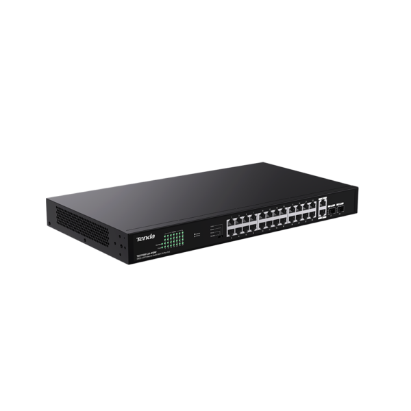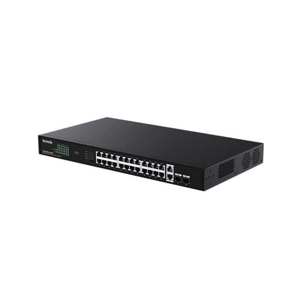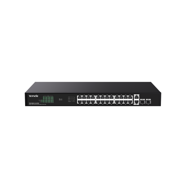 TEG1128P-24-410W is a gigabit Unmanaged Ethernet PoE switch designed by Tenda. The switch provides 24 gigabit PoE ports, 2 uplink gigabit RJ45 ports and 2 SFP ports. It supports the IEEE 802.3af/at standard and can automatically detect PDs and supply power. The maximum output power of a single port is 30W, and the power of the whole switch is 410W. It supports rack mounting, one-toggle settings, plug and play, and simple networking. It is an ideal choice for SMBs, hotels, schools, and parks with video surveillance and wireless networking requirements.