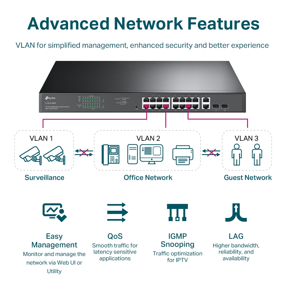 TL-SG1218MPE offers network monitoring for users to observe traffic behavior. Through its web-based user interface and management utility, the TL-SG1218MPE offers a variety of useful features, including network monitoring, traffic prioritization, and enhanced QoS.